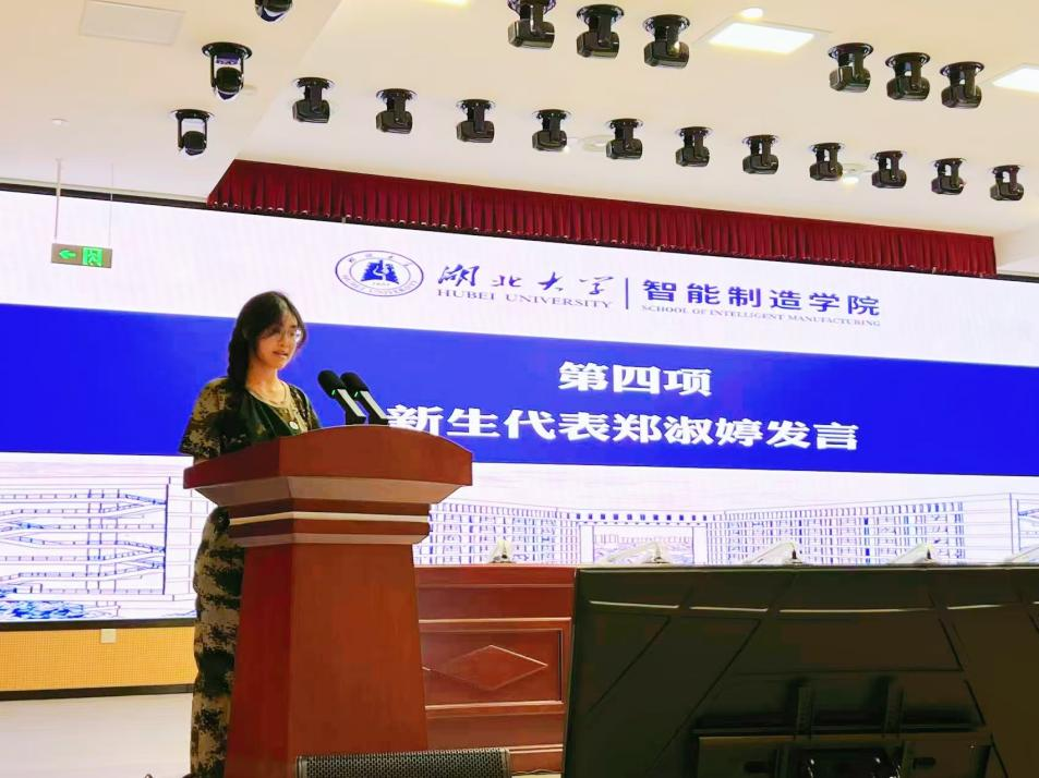 新生代表、机器人工程2501班郑淑婷上台发言。她畅谈家乡产业与所学专业的紧密联系,借此提出保持好奇、学会合作、坚守初心等三个目标,号召同学们以饱满的热情投入学习,在智能制造的未知领域勇攀高峰,用青春书写无愧于时代的答卷。