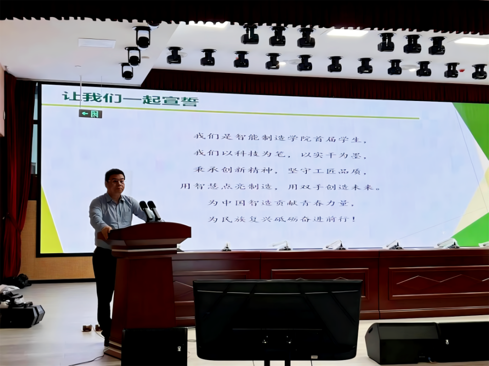 会议下半场,学院副院长(主持行政工作)胡永明以“智启未来,智造新生”为主题,为新生带来了一场生动的“开学第一课”。他结合学院发展历程与行业前沿动态,深刻阐述了智能制造的未来图景,胡院长寄语新生,要努力成长为“有扎实技术、有创新思维、有坚定信念”的“三有智造人”。随后,在胡院长的带领下,全场200余名新生庄严宣誓:“为中国智造贡献青春力量,为民族复兴砥砺奋进前行!”铿锵的誓言在会场回荡,展现了我院首届学子投身制造强国的坚定决心与昂扬风貌。